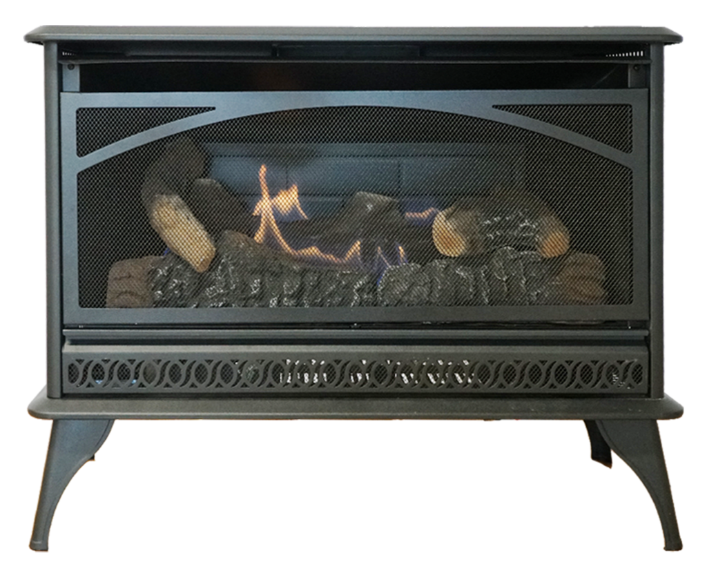 The HearthRite Vent-Free Stove features a dual burner, decorative arch screen and five